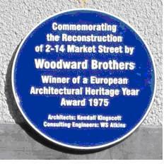 Returning to Market Street, a blue plaque commemorates the restoration of numbers 2 to 14 by builders Robert and John Woodward. The ancient houses and shops became dilapidated and were demolished. The work received the rare distinction of a European Architectural Heritage Year Award in 1975. Later the brothers constructed a replica of the Woodchester Roman pavement in the tabernacle.